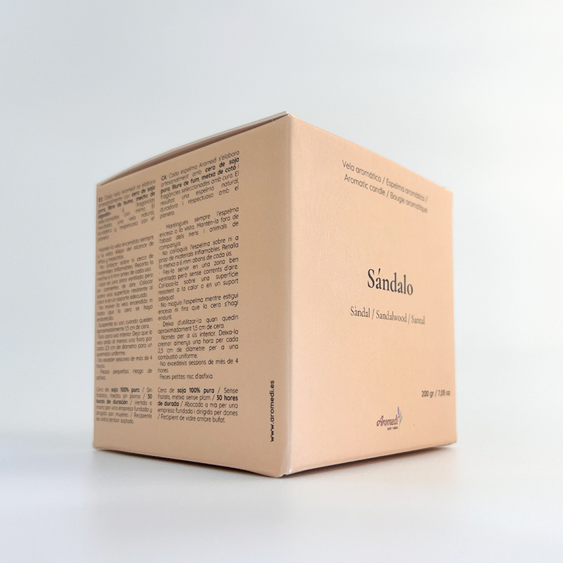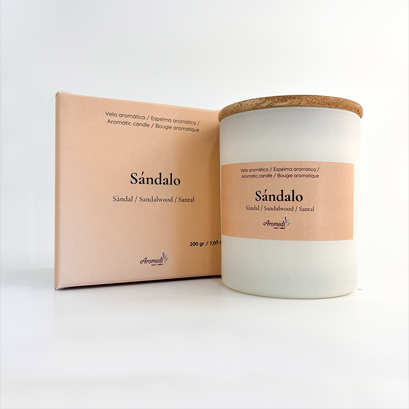 Vela artesanal de cera de soja con fragancia natural de sándalo. Aroma cálido, amaderado y meditativo, ideal para crear ambientes relajantes y favorecer la concentración y la calma interior.